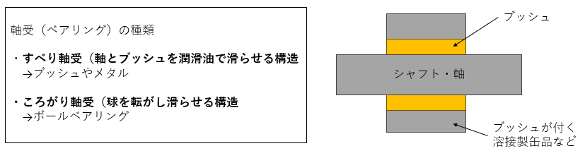 ブッシュメタル、軸受けメタルなど呼び方は様々ですが、機能や目的はブッシュと同じです。